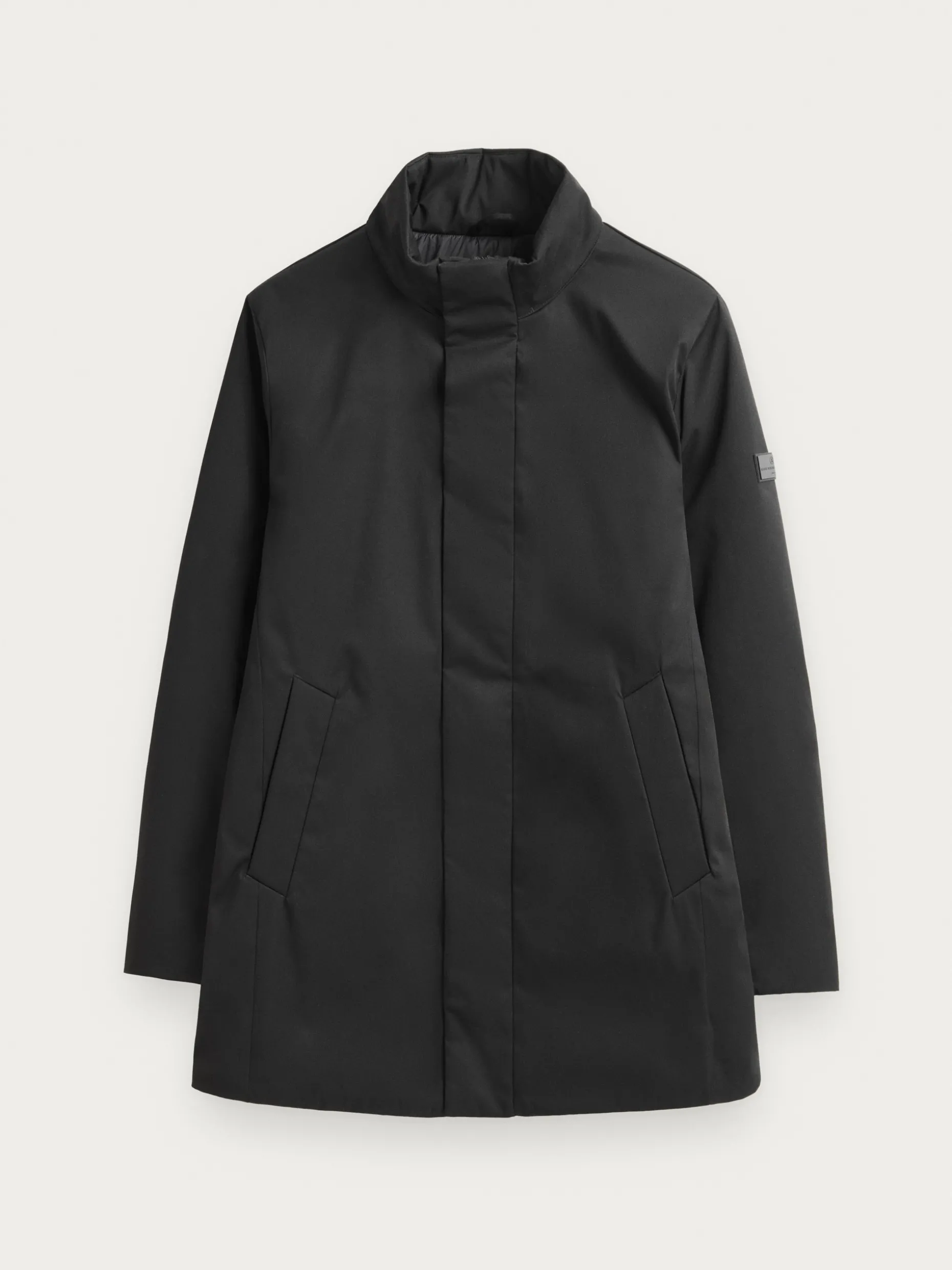 Parka larga acolchada con cuello subido y gorro desmontable. Cierre central mediante cremallera oculta por tapeta de botones a presión, dos bolsillos en la cintura y detalle personalizado en una de las mangas. Forrada y con bolsillos en el interior.