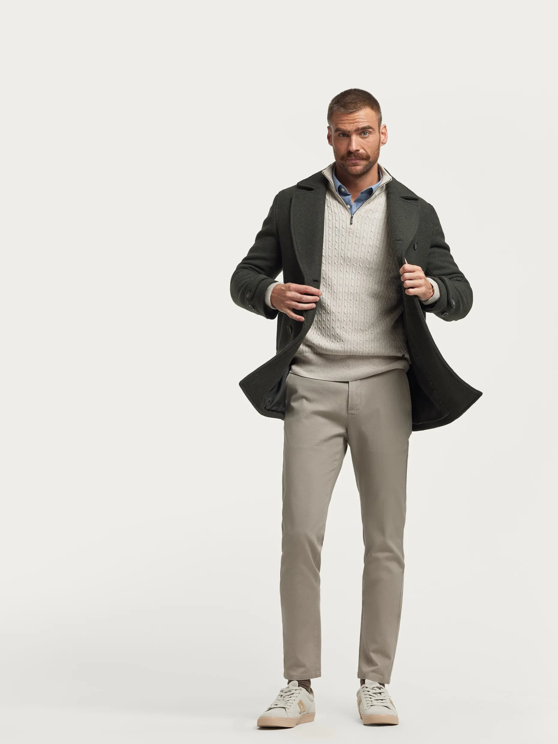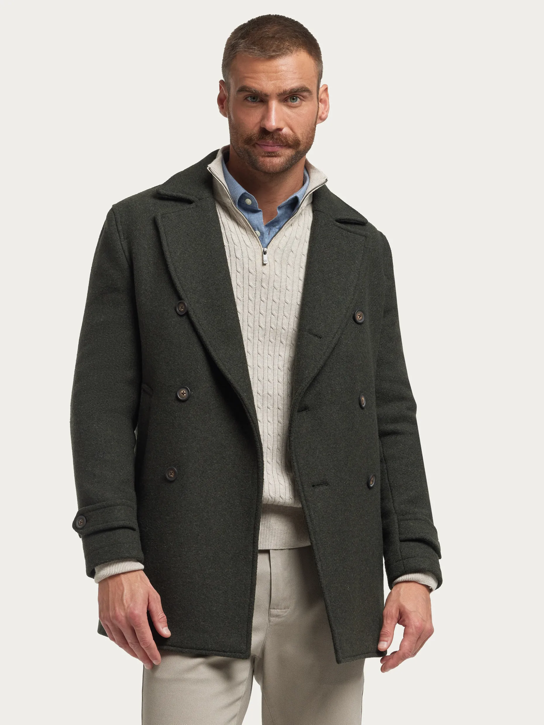 Abrigo de corte regular fit que cuenta con cuello y solapa, cierre central cruzado mediante botonadura en efecto madera y dos bolsillos en la cintura. Abertura en el centro de la espalda. Forrado en su interior con dos bolsillos.