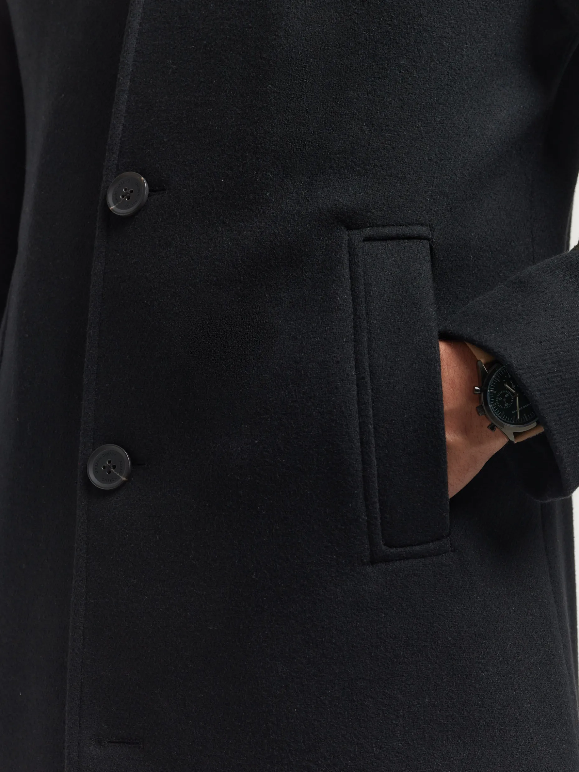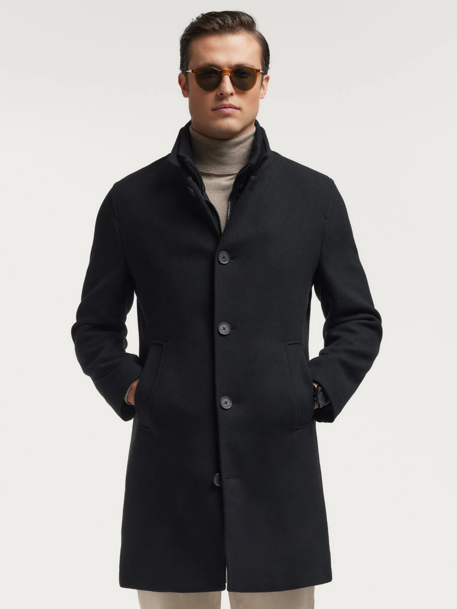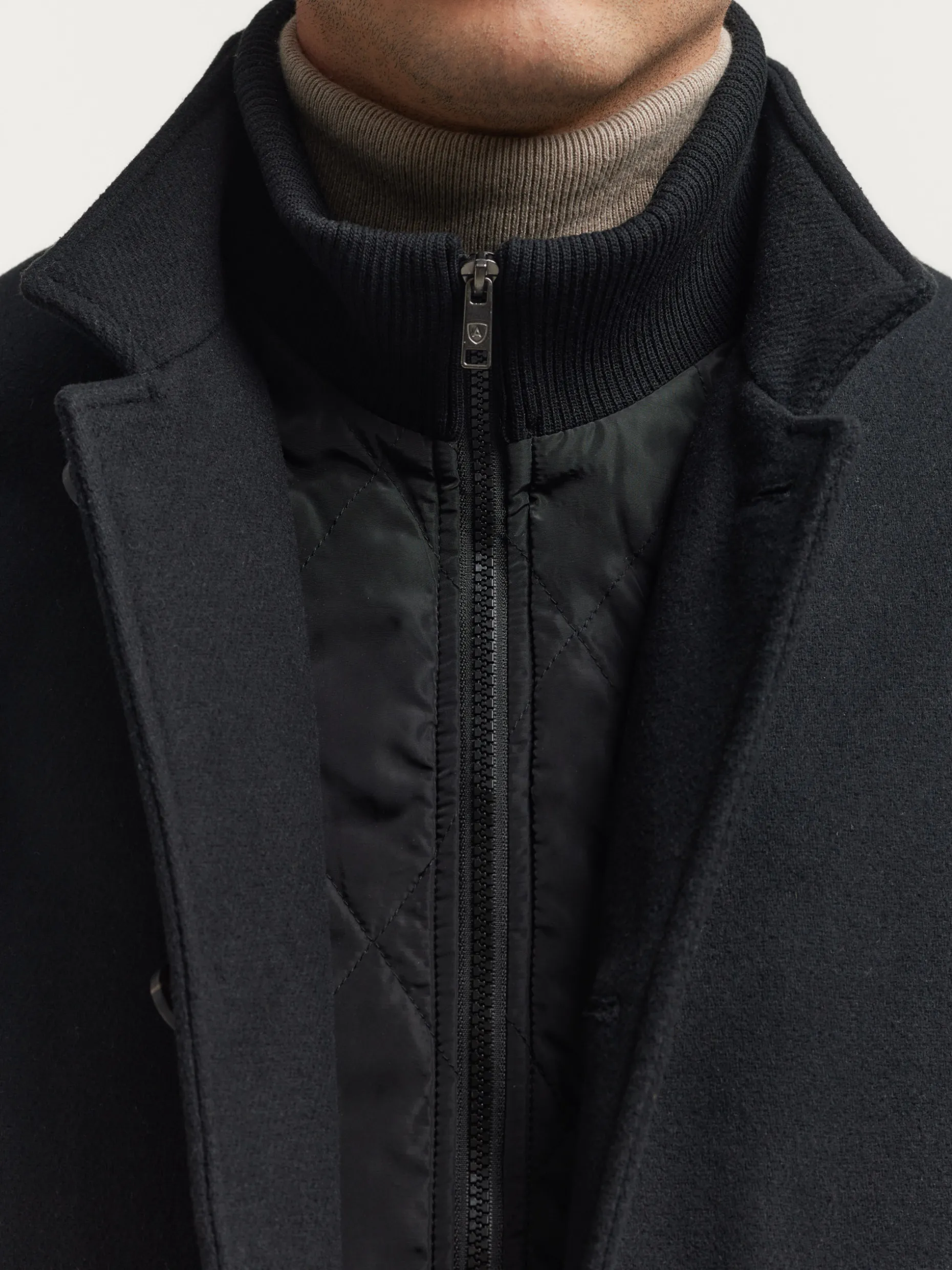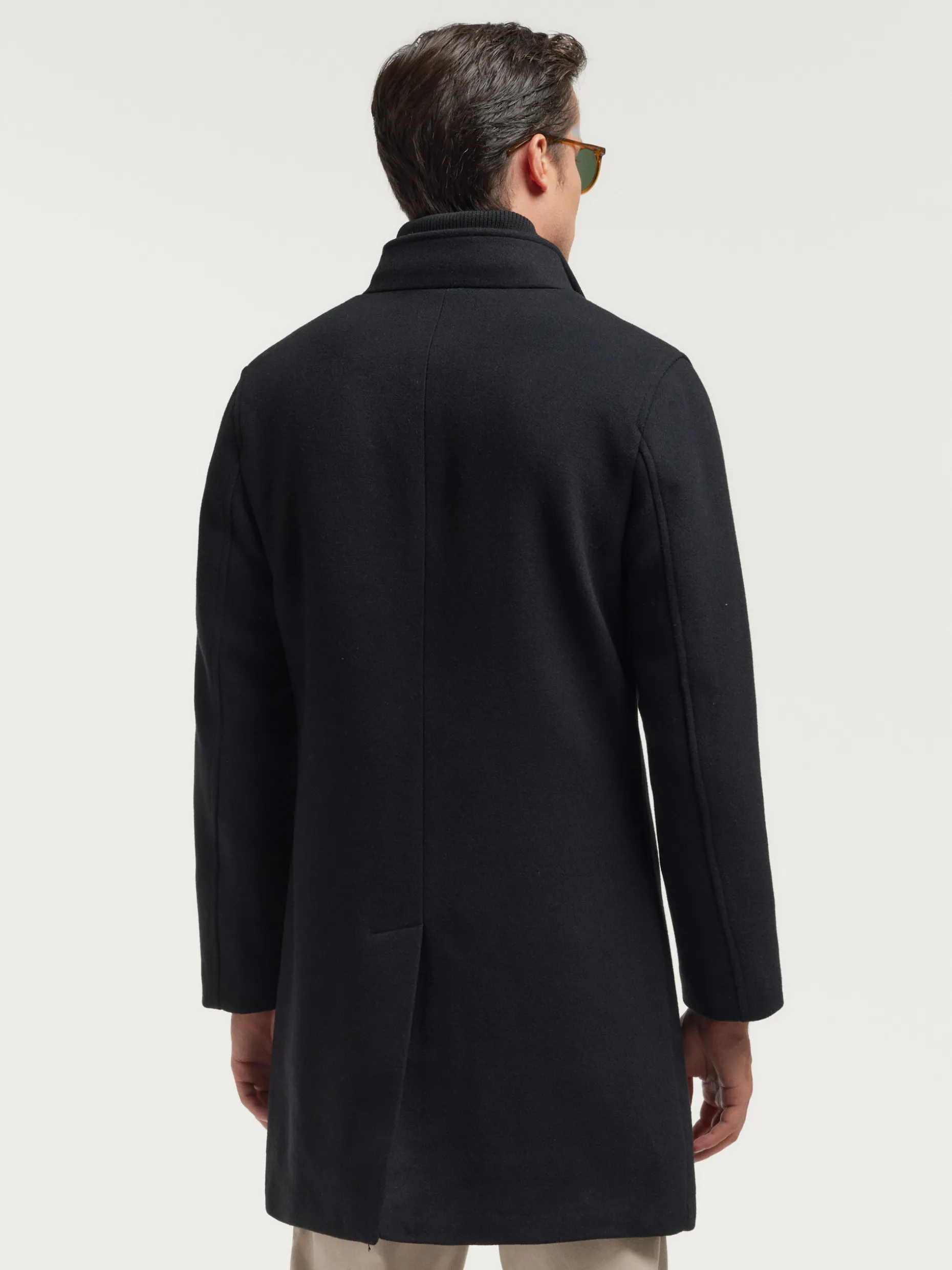 Abrigo con chalequillo interior de cuello subido y desmontable mediante cremallera. Cuenta con cuello y solapa, cierre central simple mediante botonadura efecto madera, cierre del chalequillo por cremallera y abertura en el bajo de la espalda. Dos bolsillos en la cintura y dos bolsillos en su interior. Corte regular fit.