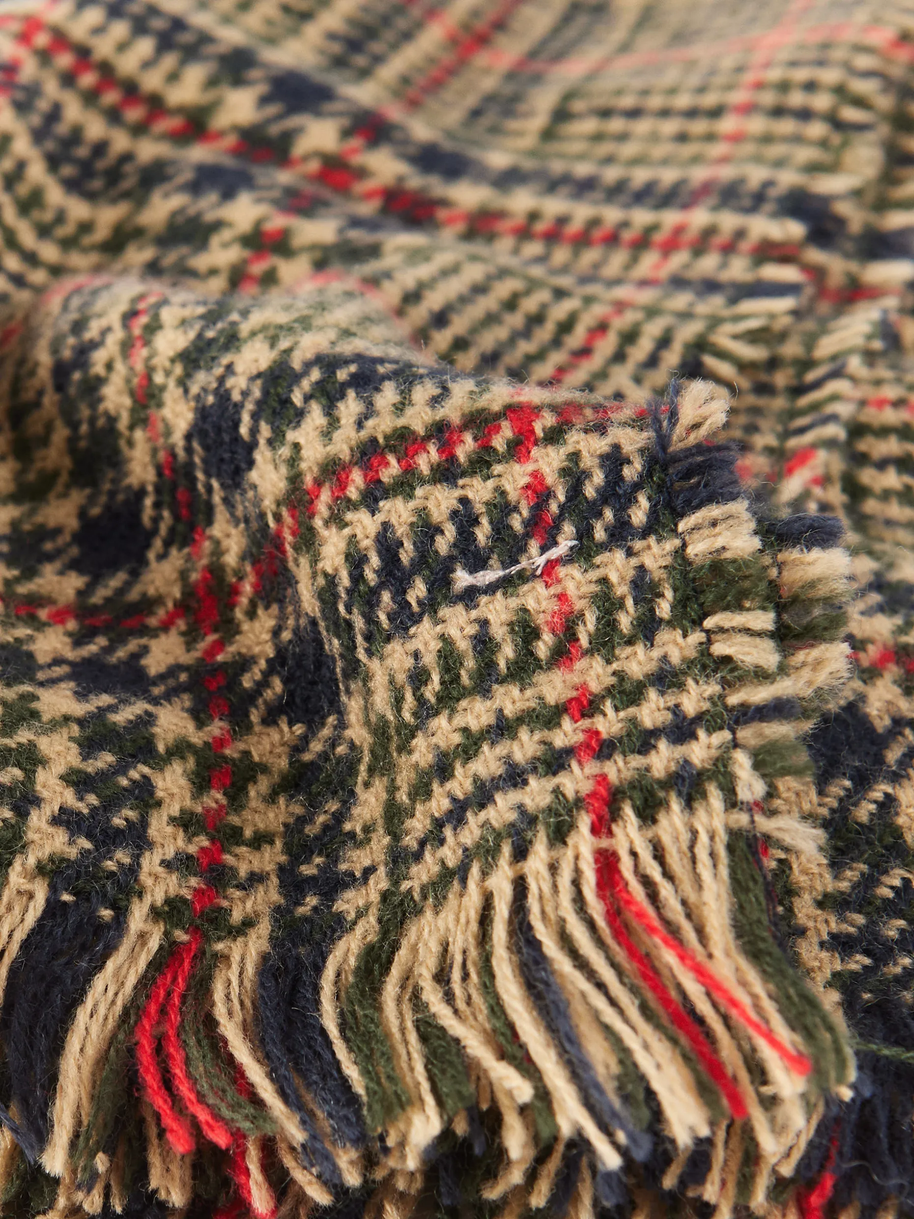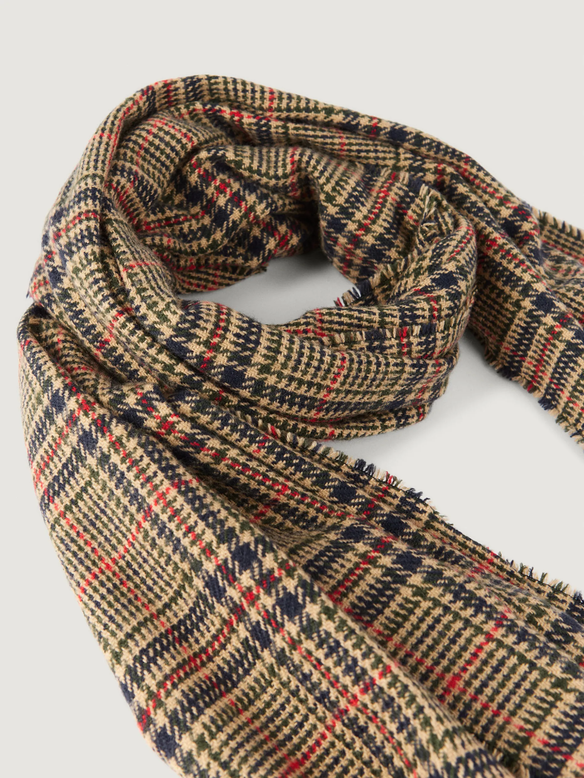 Bufandas con diseño de cuadros confeccionada en 100% acrílico. Terminación de flecos decorativos y tacto suave.