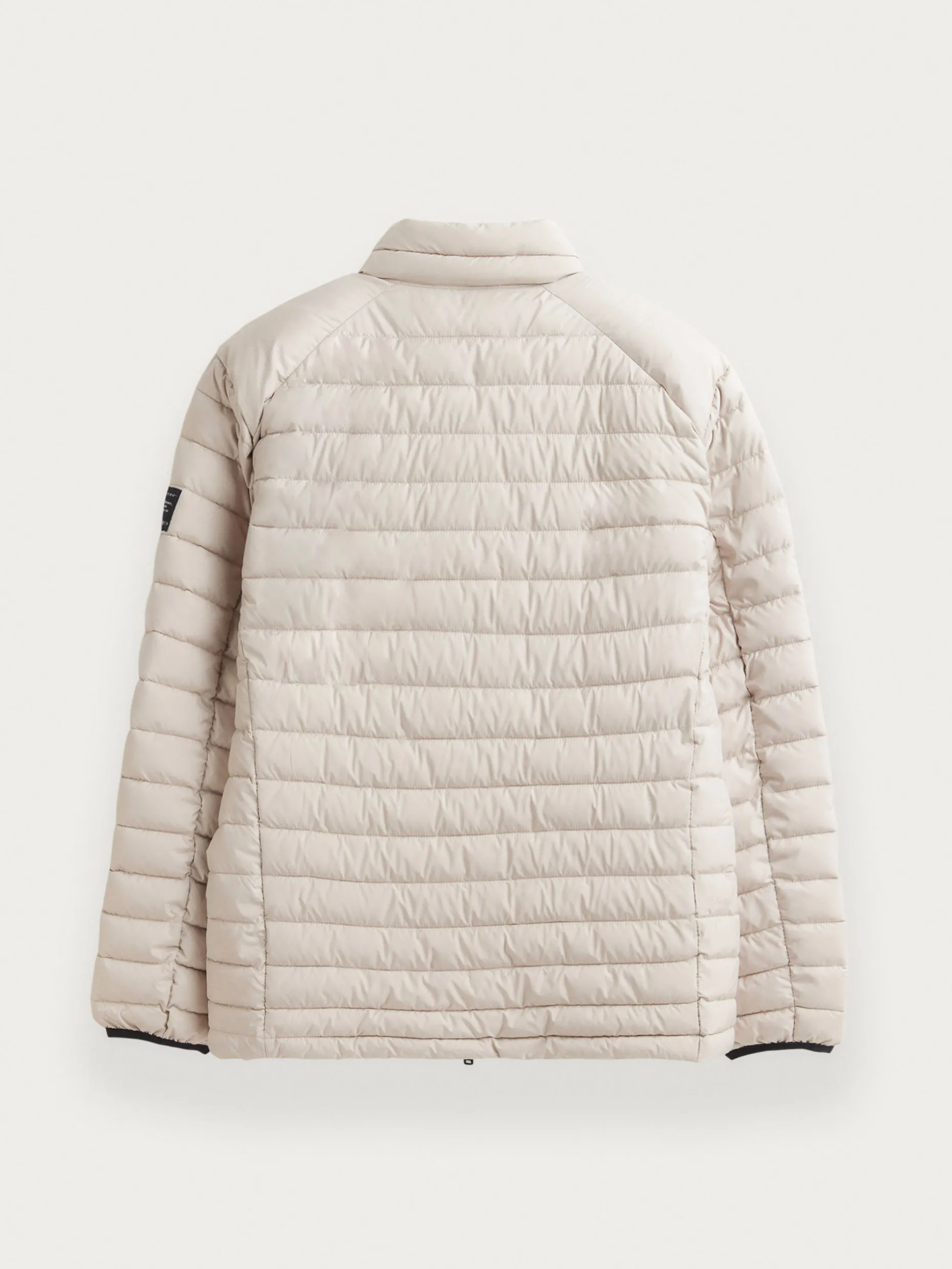 Cazadora acolchada con cuello subido, cierre central mediante doble cremallera, manga larga con puños elásticos y dos bolsillos en la cintura con cierre mediante cremallera. Detalle personalizado en una de sus mangas.