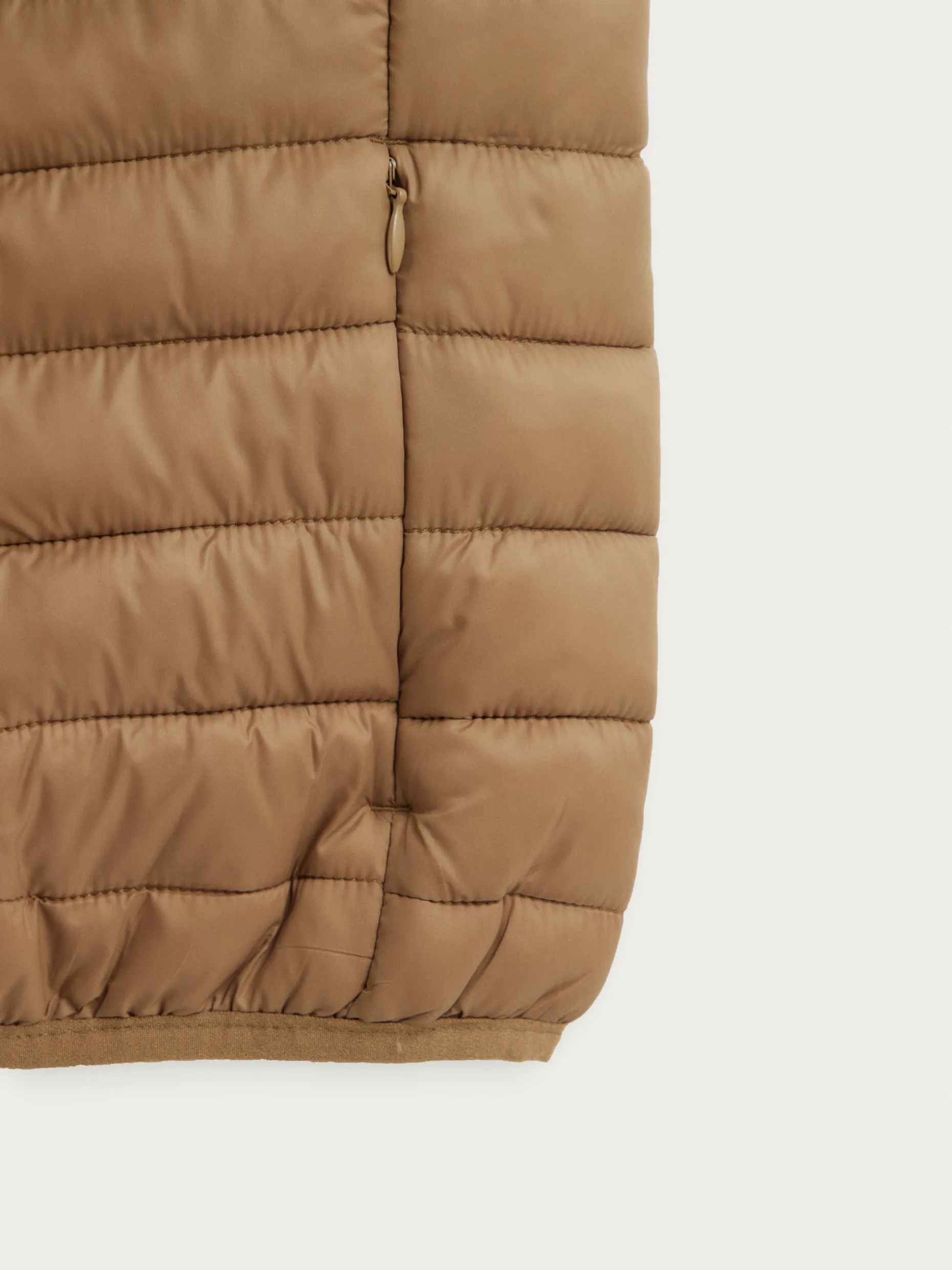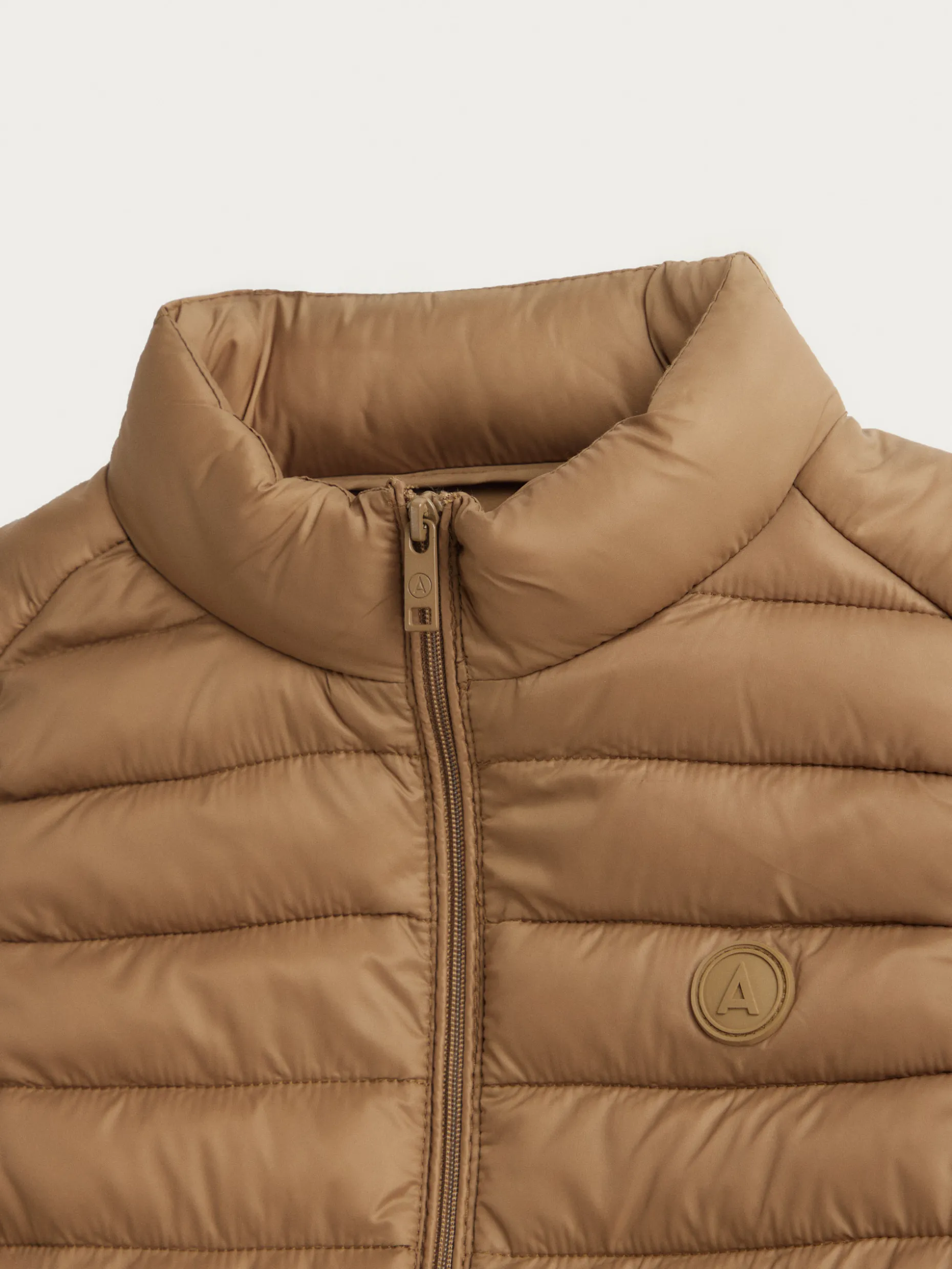 Chaleco acolchado con cuello subido y cierre central mediante cremallera, dos bolsillos a la altura de la cintura y logo de la marca grabado en el pecho. Elástico en la sisa y cintura. Forro interior a contraste con bolsillos.