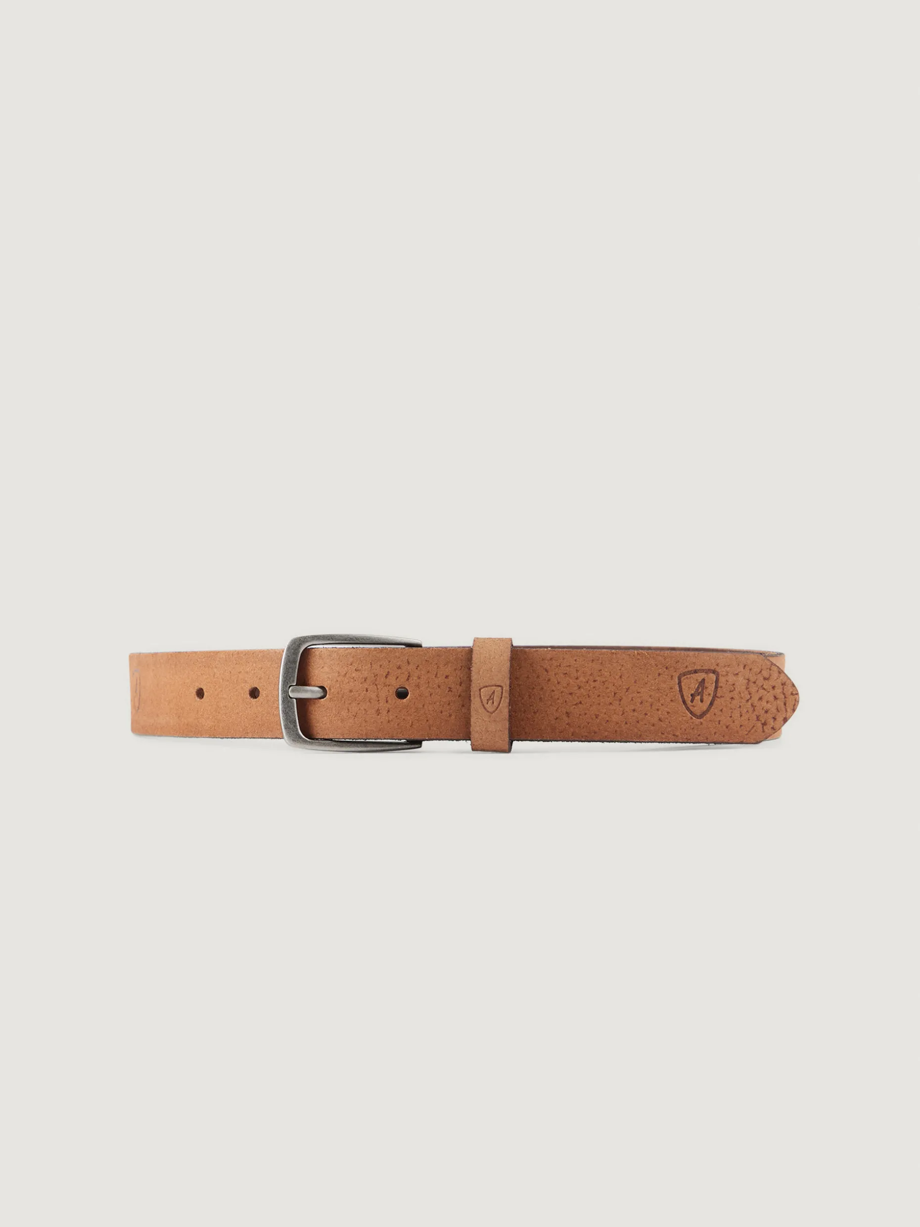 Cinturón confeccionado en piel con cierre central mediante hebilla metálica, pasador al tono y logo de la marca grabado al tono.