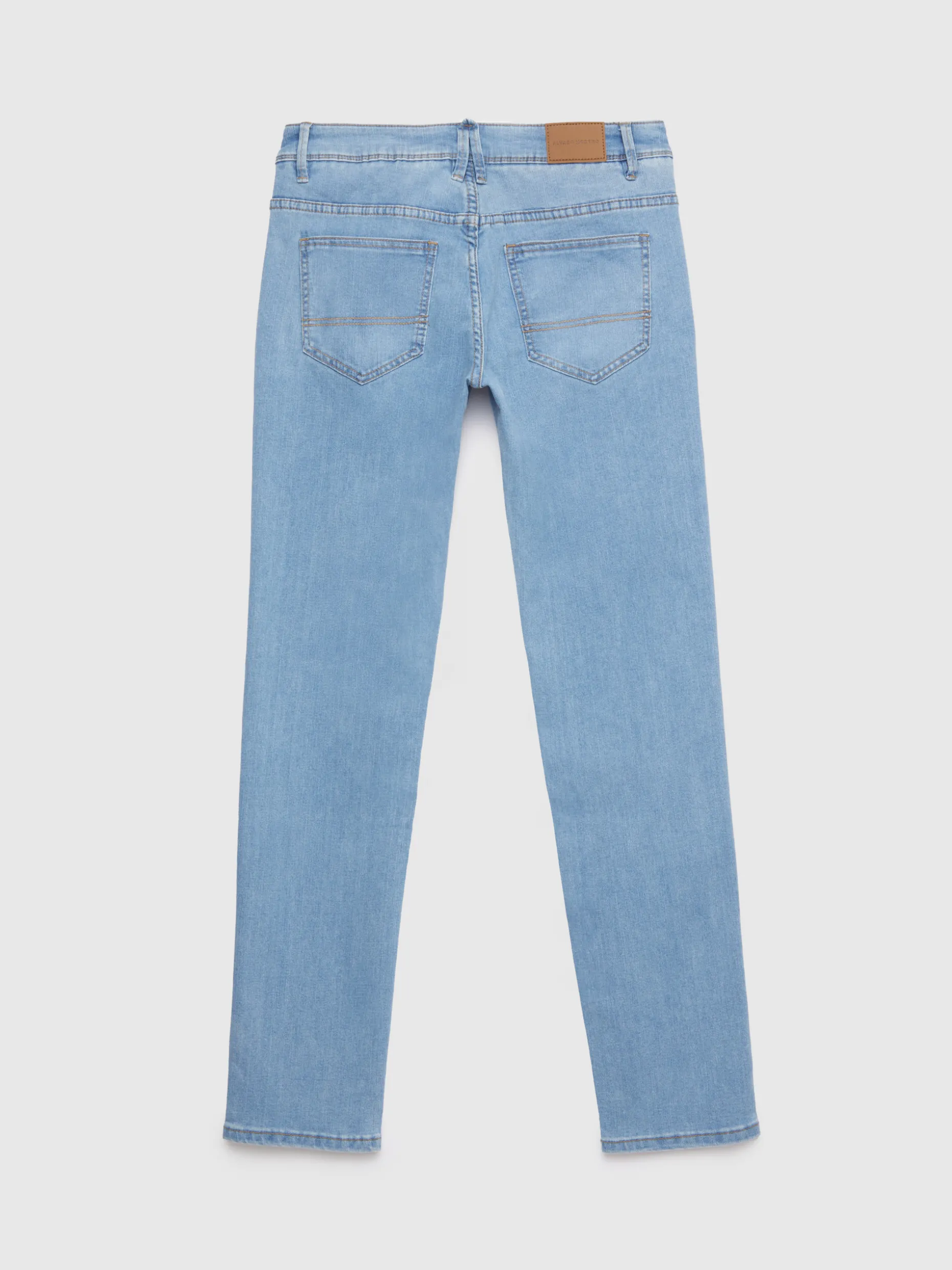 Pantalón denim de corte regular fit con cinco bolsillos y cierre central mediante botón y cremallera, pespuntes en color camel, fornituras personalizadas y etiqueta en efecto piel en la cinturilla.