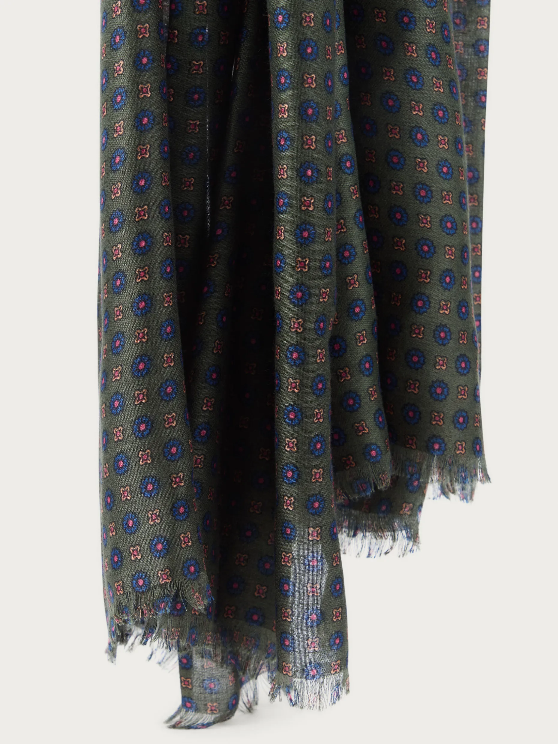 Foulard de diseño personalizado estampado confeccionado en tejido suave y cálido. Terminación con flecos.