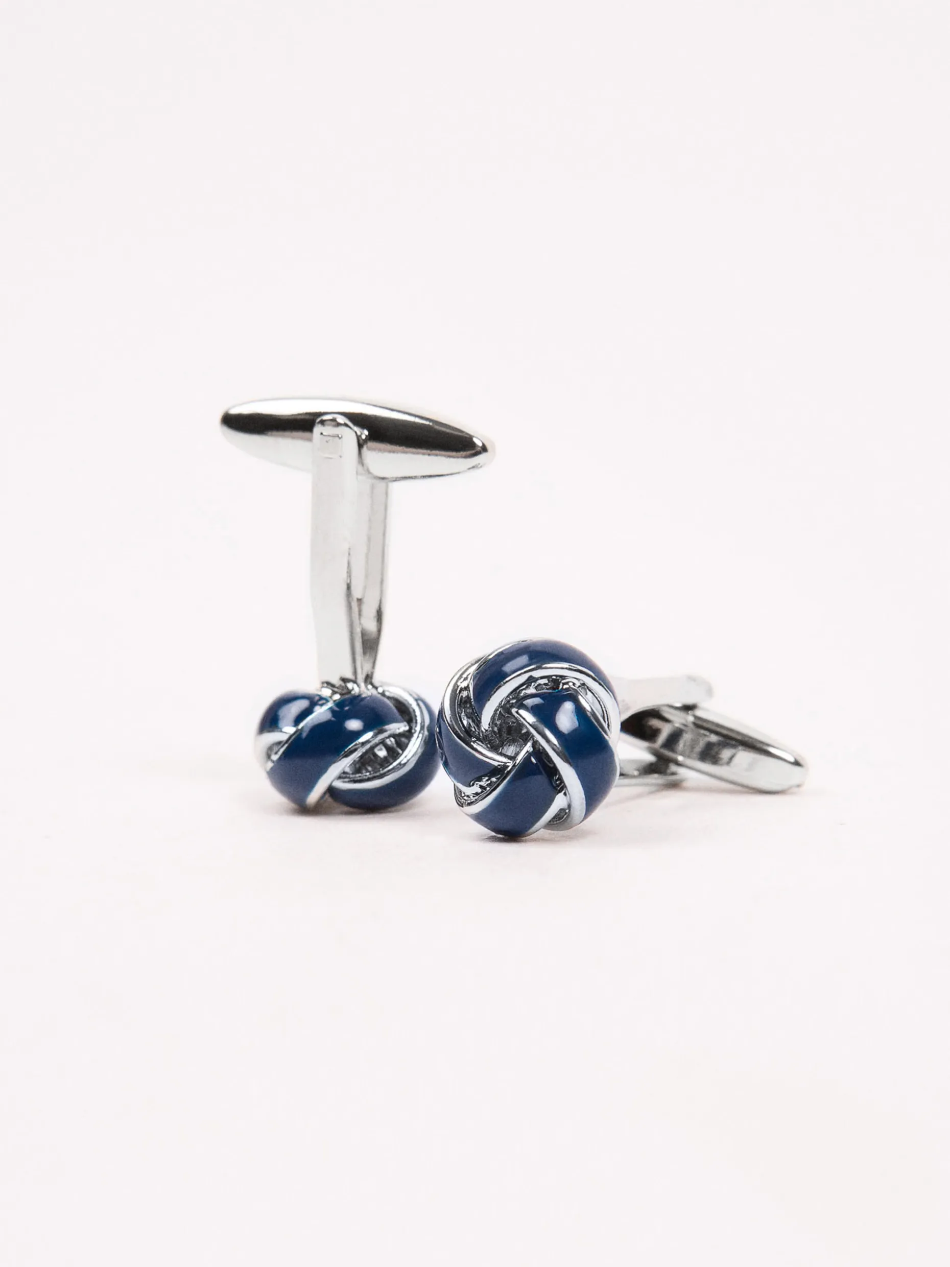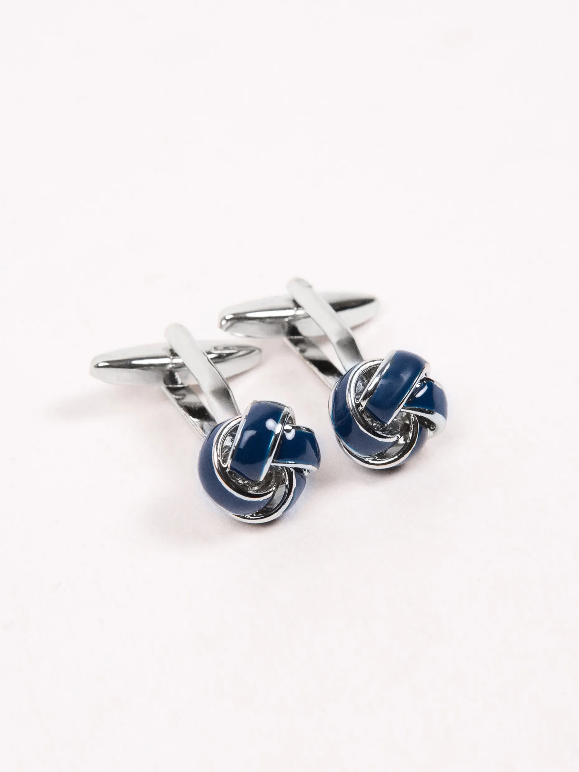 Gemelo metálico con forma de nudo que cuenta con esmalte en marino.