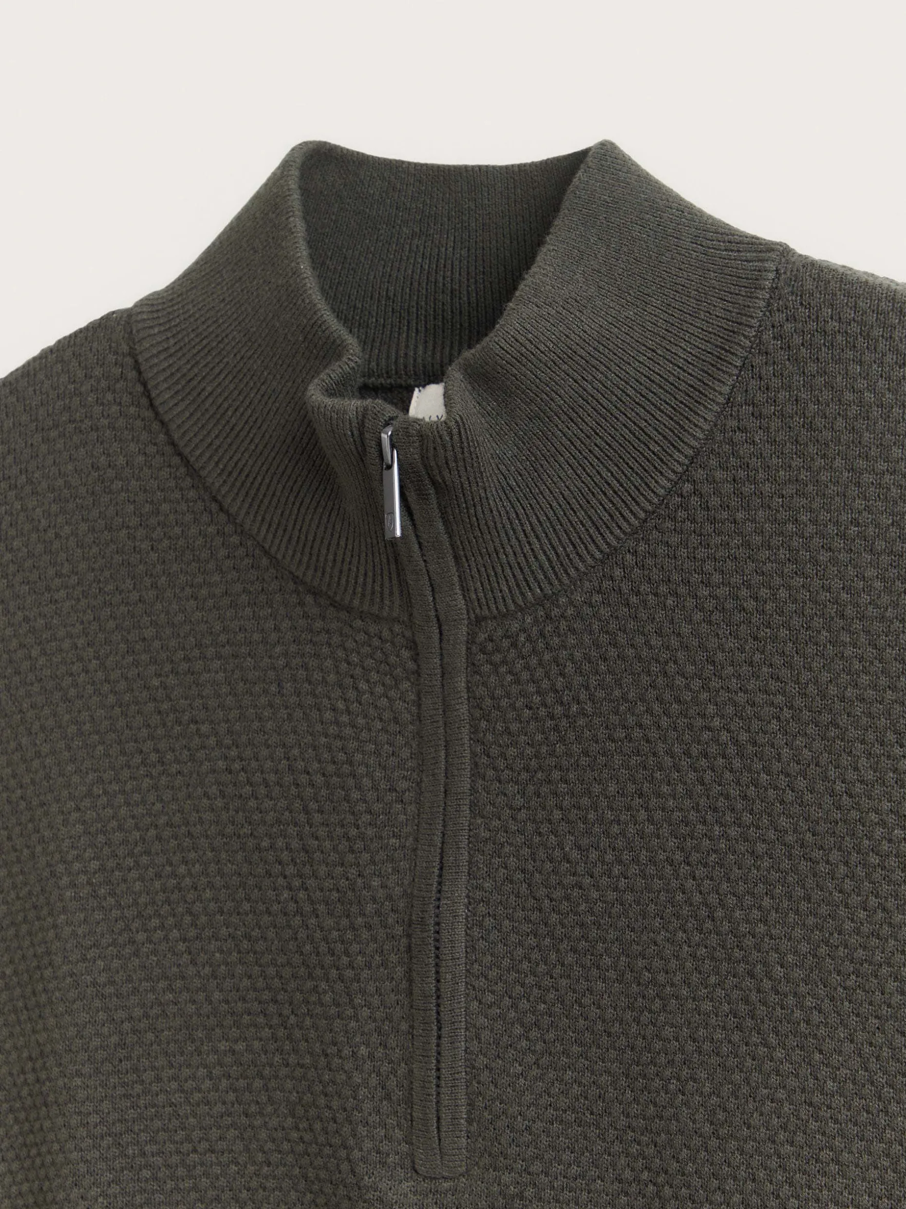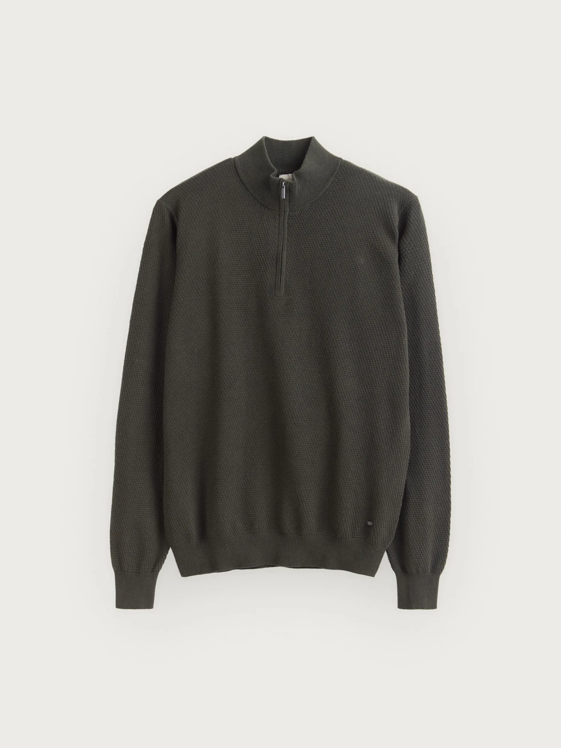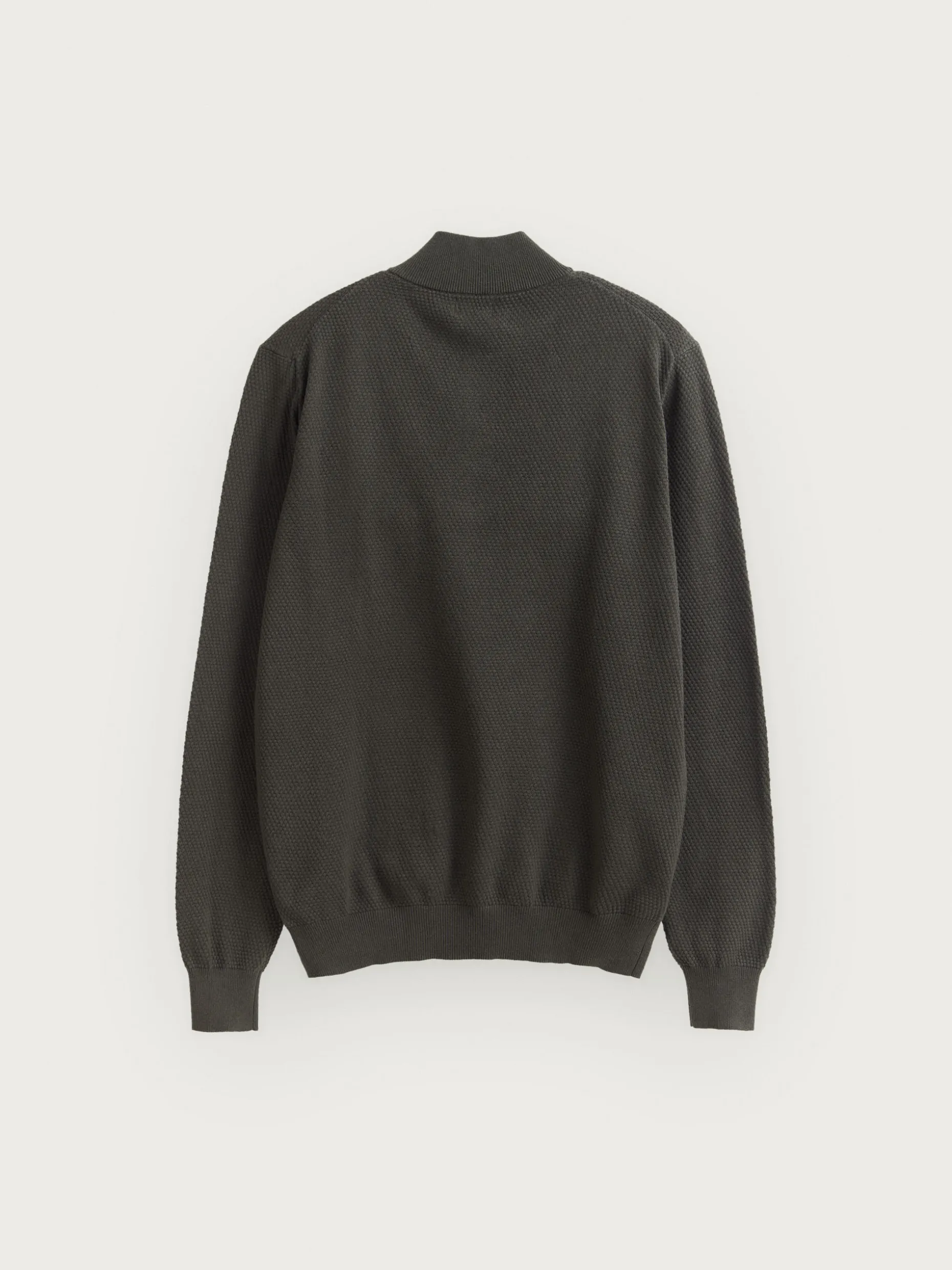 Jersey confeccionado en algodón con estructura en su tejido. Cuenta con cuello alto con medio cierre de cremallera y cuello, puños y bajo en acabado elástico. Corte regular fit.