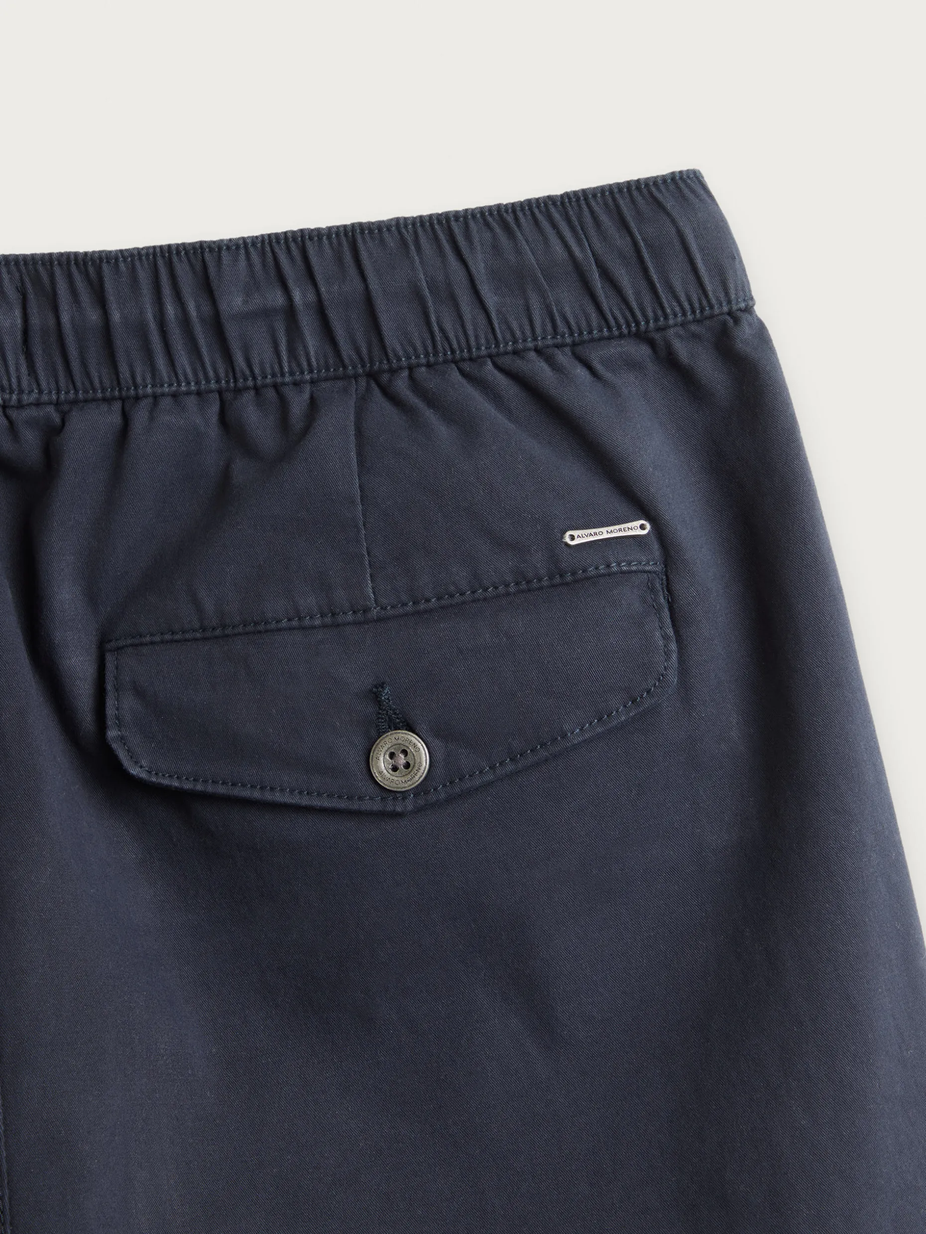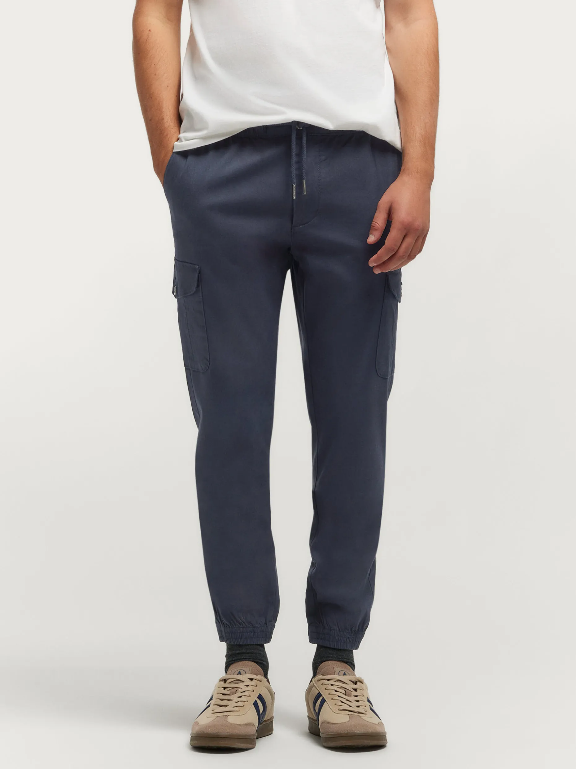 Pantalón cargo con cierre central mediante botón, cremallera y cordón ajustable al tono. Cinturilla elástica, bajo acabado en puño elástico y detalle personalizado en la parte trasera. Dos bolsillos frontales, dos en el lateral con cierre mediante tapeta y botón y dos bolsillos traseros. Corte regular fit.