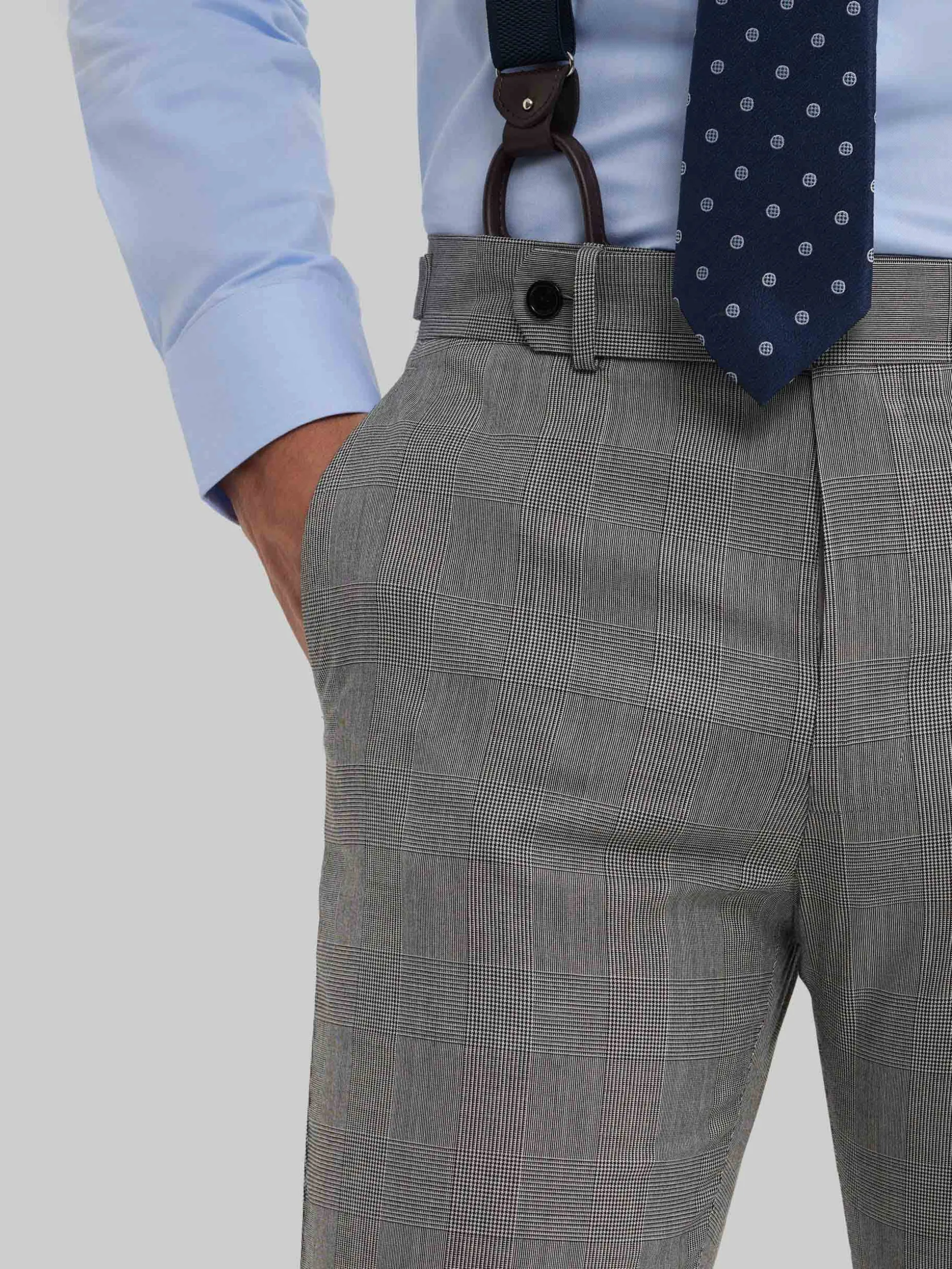 Pantalón de traje en tejido a cuadros que cuenta con cierre frontal con prolonga de botón desplazado y cremallera, dos bolsillos en el frontal y un bolsillo con cierre de botón en la parte trasera. Bajo con vuelta y detalle ajustable en la cintura. Forrado en su interior.