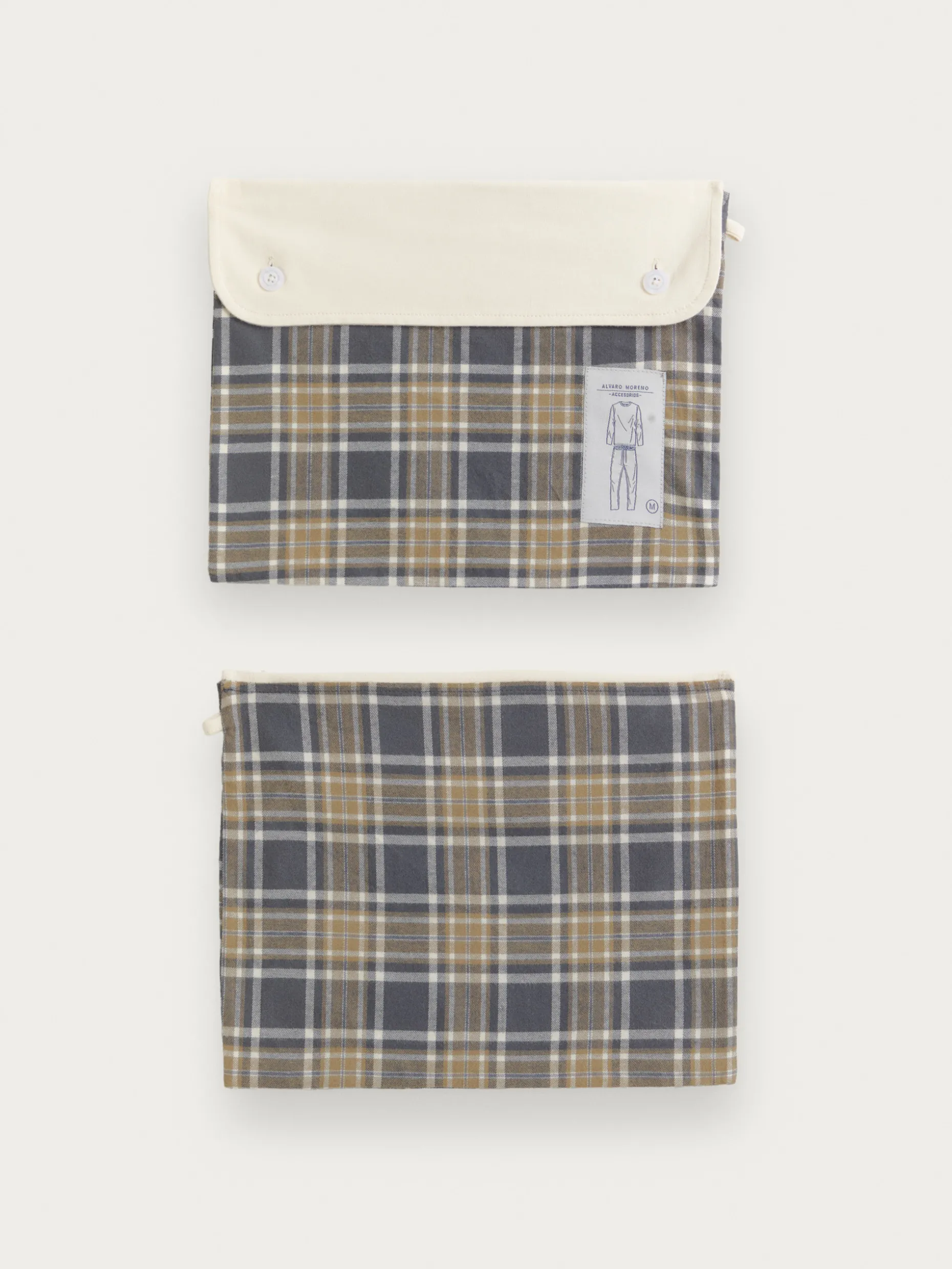 Pijama compuesto por dos piezas, superior e inferior. Parte superior camiseta de manga larga con cierre mediante tres botones en el cuello. Pantalón a cuadros con cinturilla elástica y cordón ajustable.