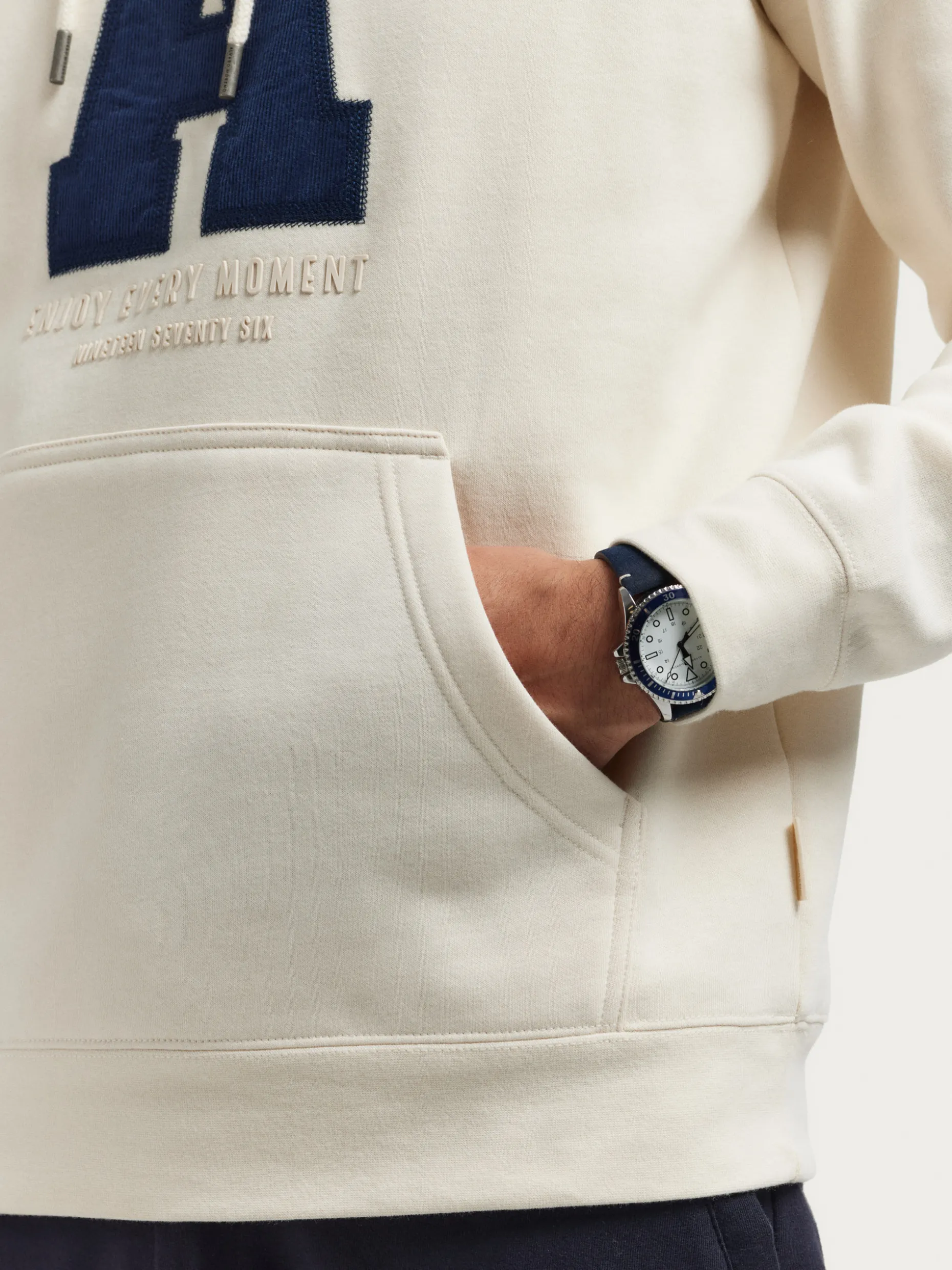 Sudadera con gorro ajustable mediante cordón al tono, estampado personalizado en el frontal y bolsillo estilo canguro en la cintura. Etiqueta canvas en el lateral. Puños y bajos en acabado elástico. Corte regular fit.